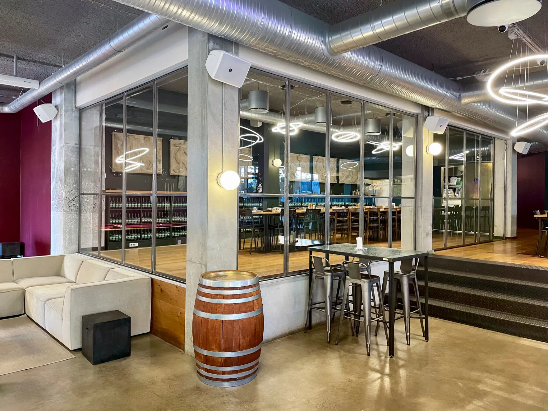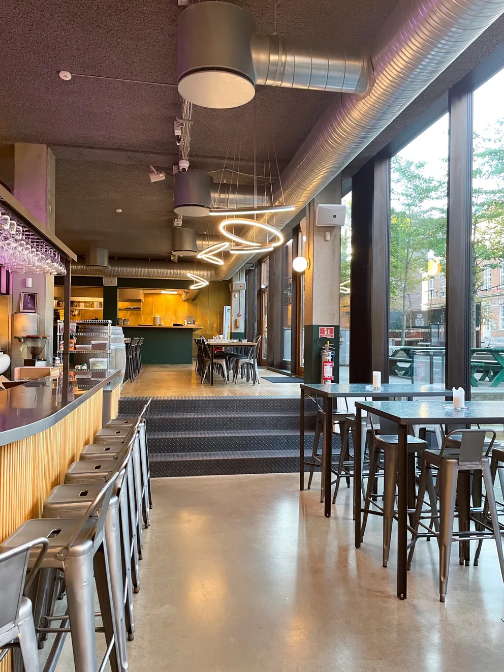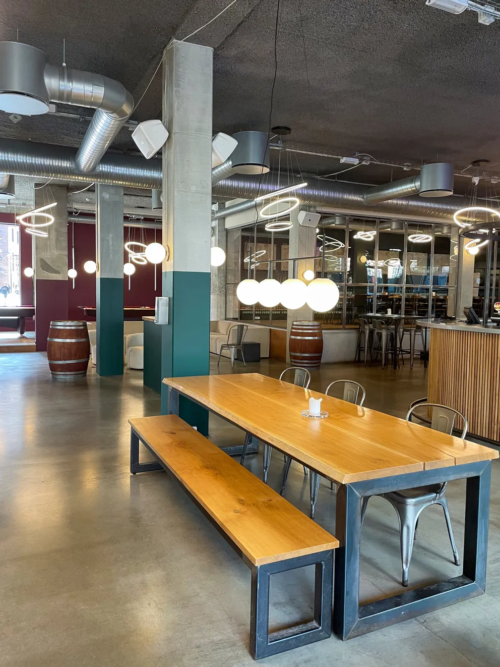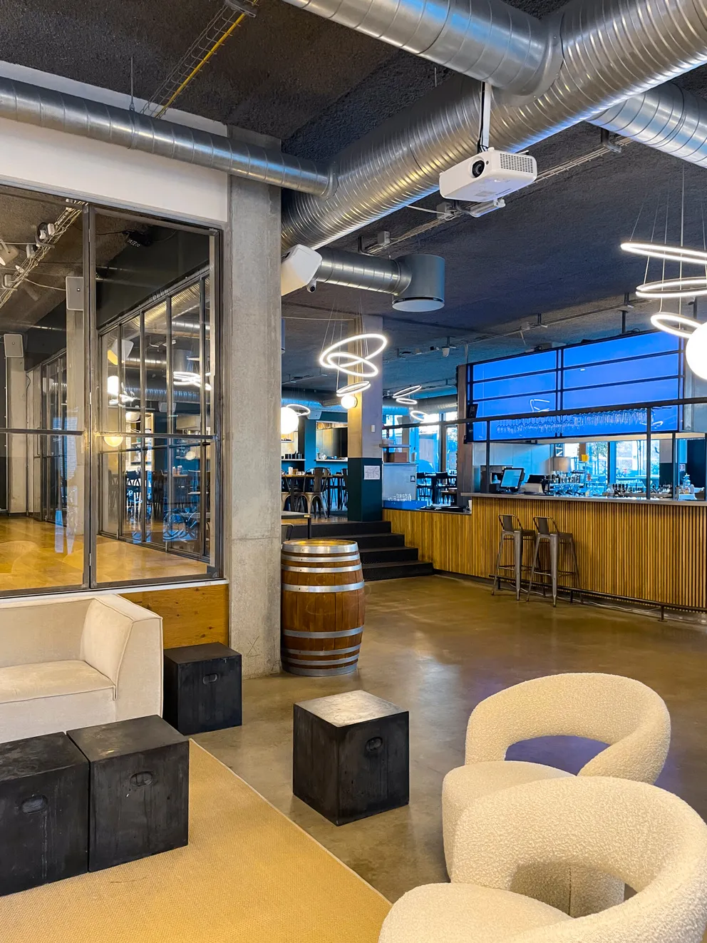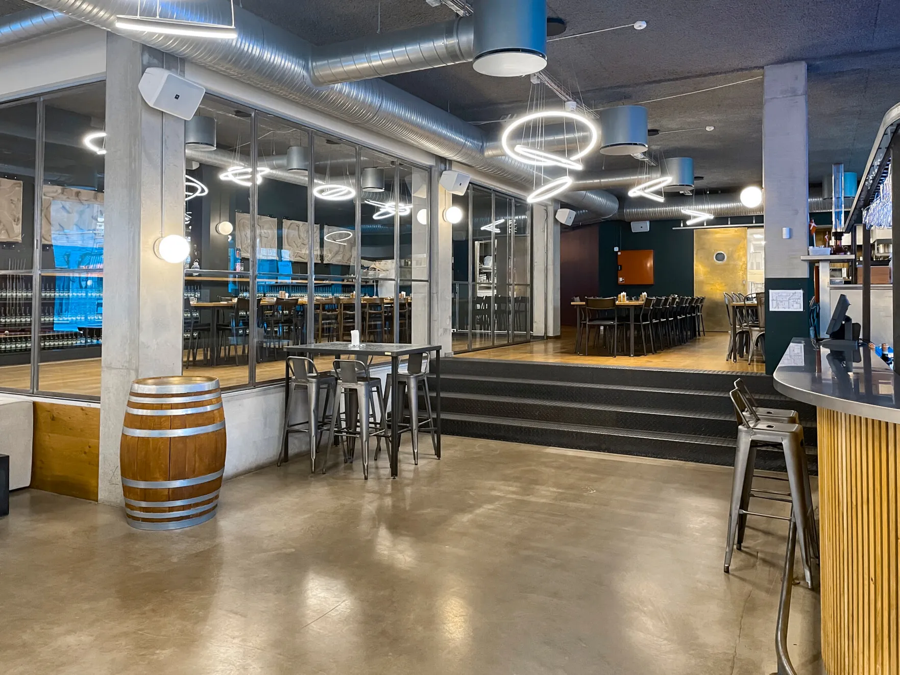 Et stort, lyst og rustikt lokale, opdelt i niveauer, hvor gennemsigtigheden skaber forbindelse på tværs af rummene. Små hjørner giver plads til intimitet og afgrænsning, samtidig med at de indgår naturligt i den større helhed, hvor mange kan samles og føle sig forbundet.