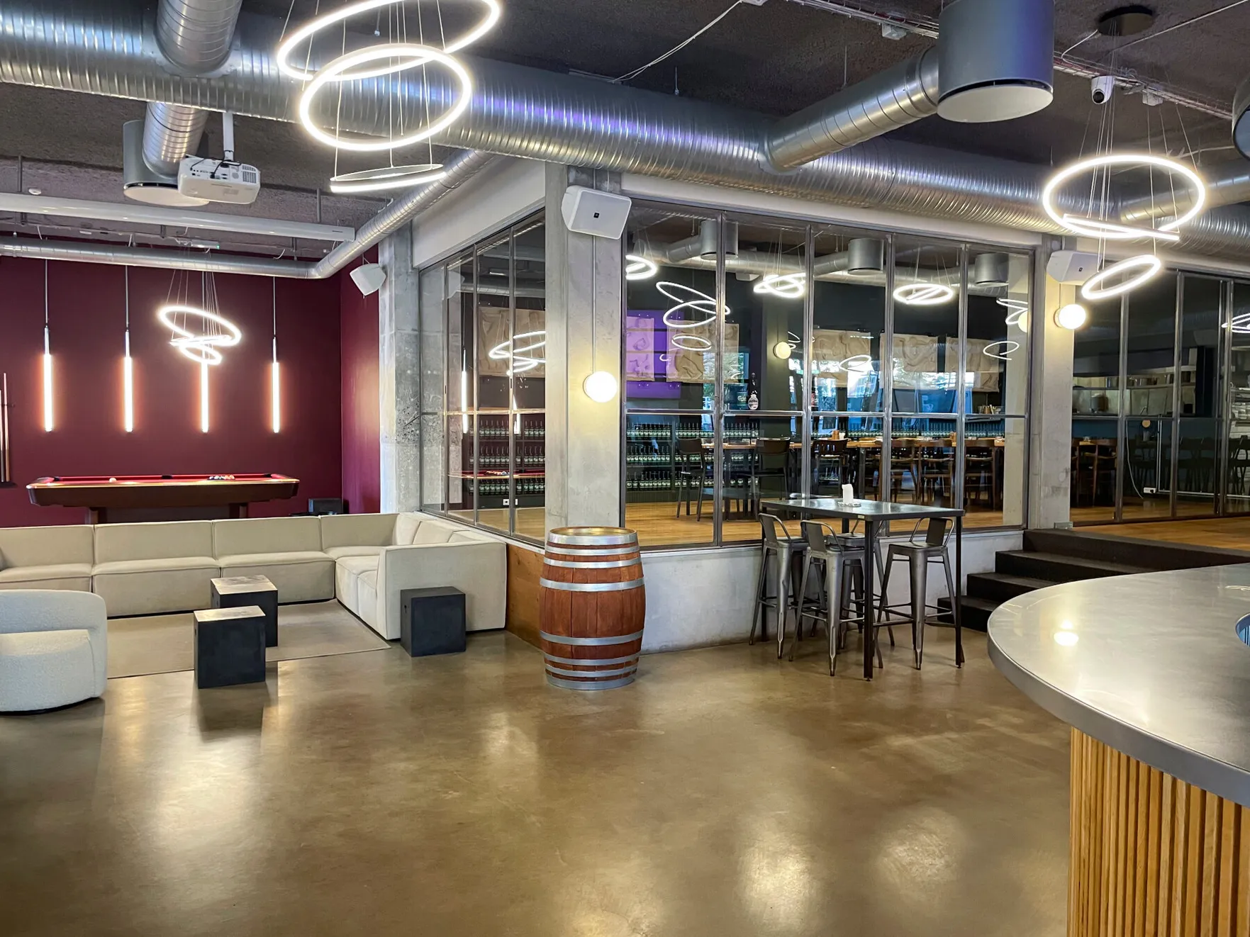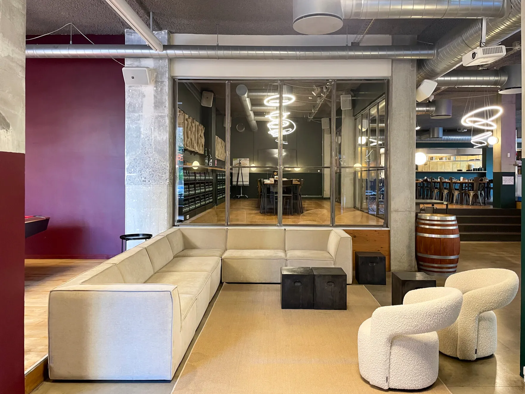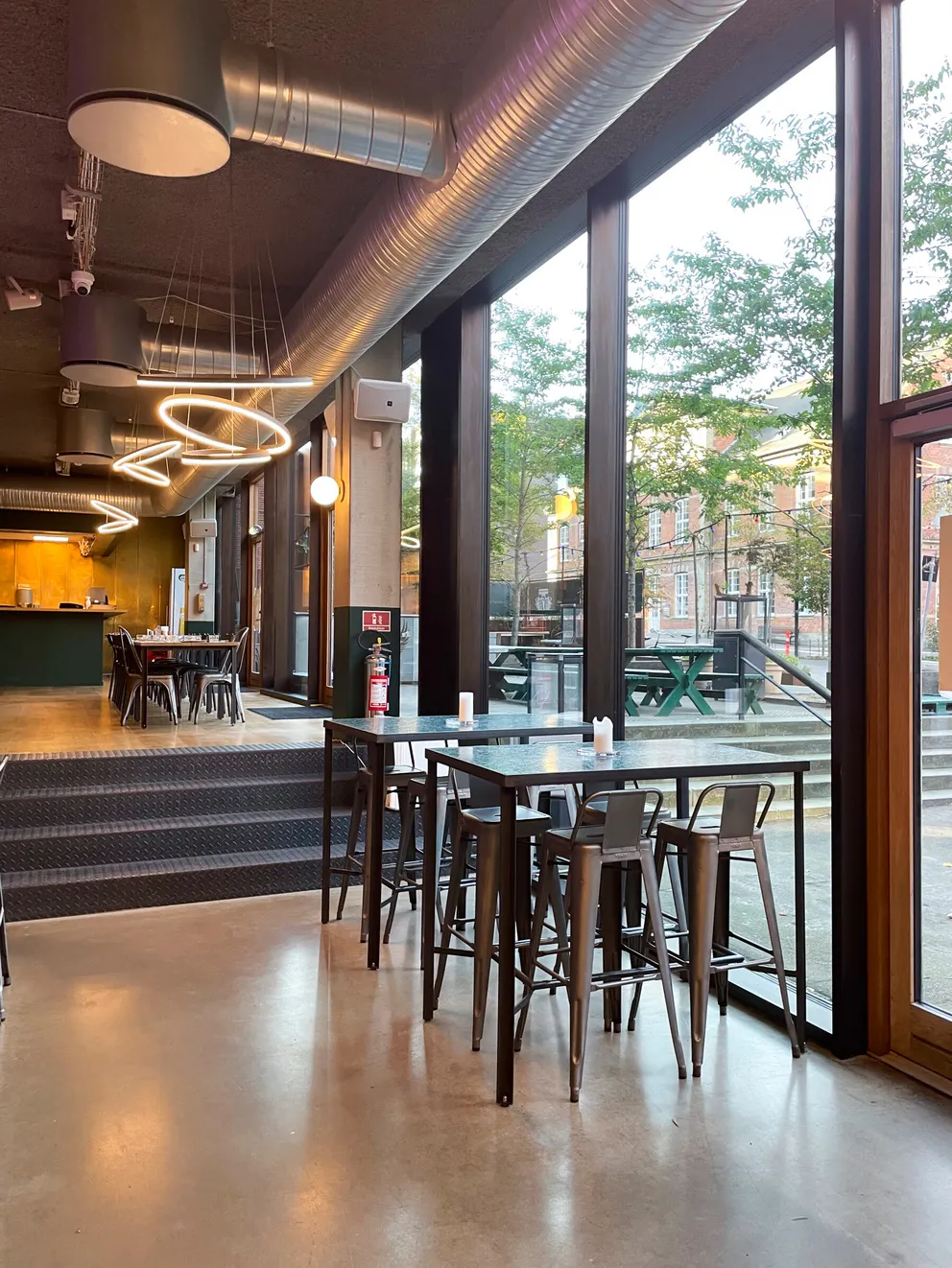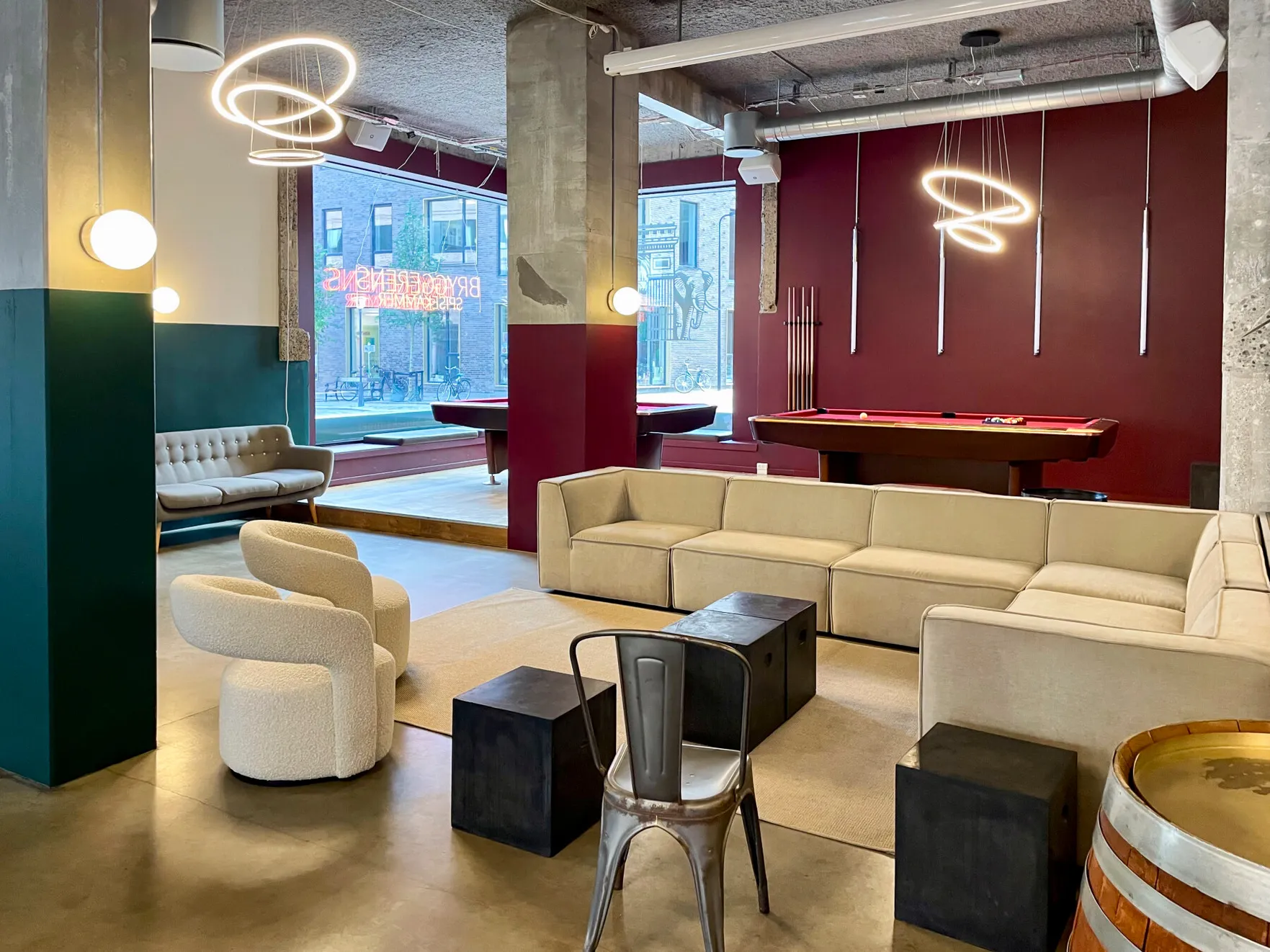 Et stort, lyst og rustikt lokale, opdelt i niveauer, hvor gennemsigtigheden skaber forbindelse på tværs af rummene. Små hjørner giver plads til intimitet og afgrænsning, samtidig med at de indgår naturligt i den større helhed, hvor mange kan samles og føle sig forbundet.