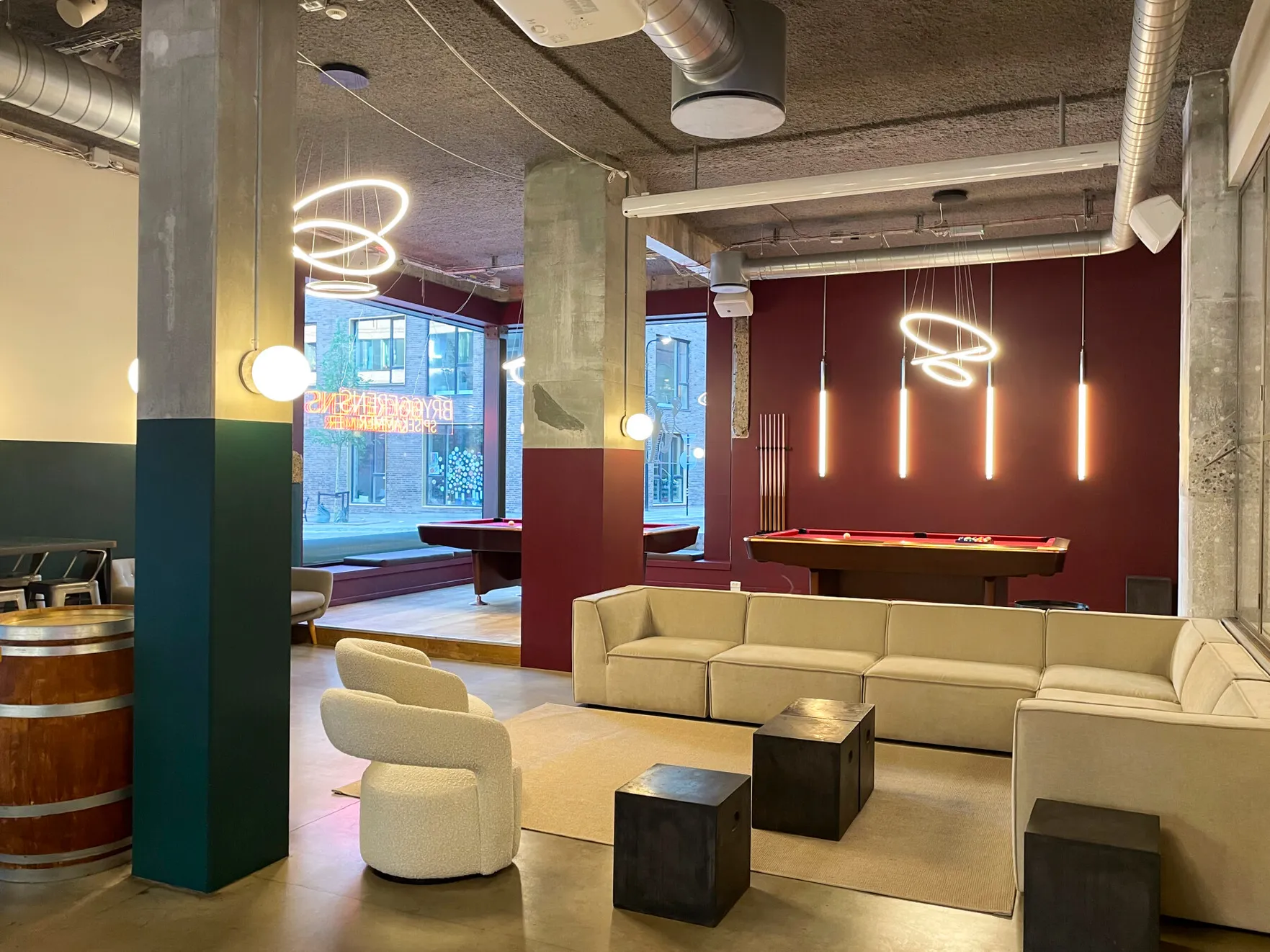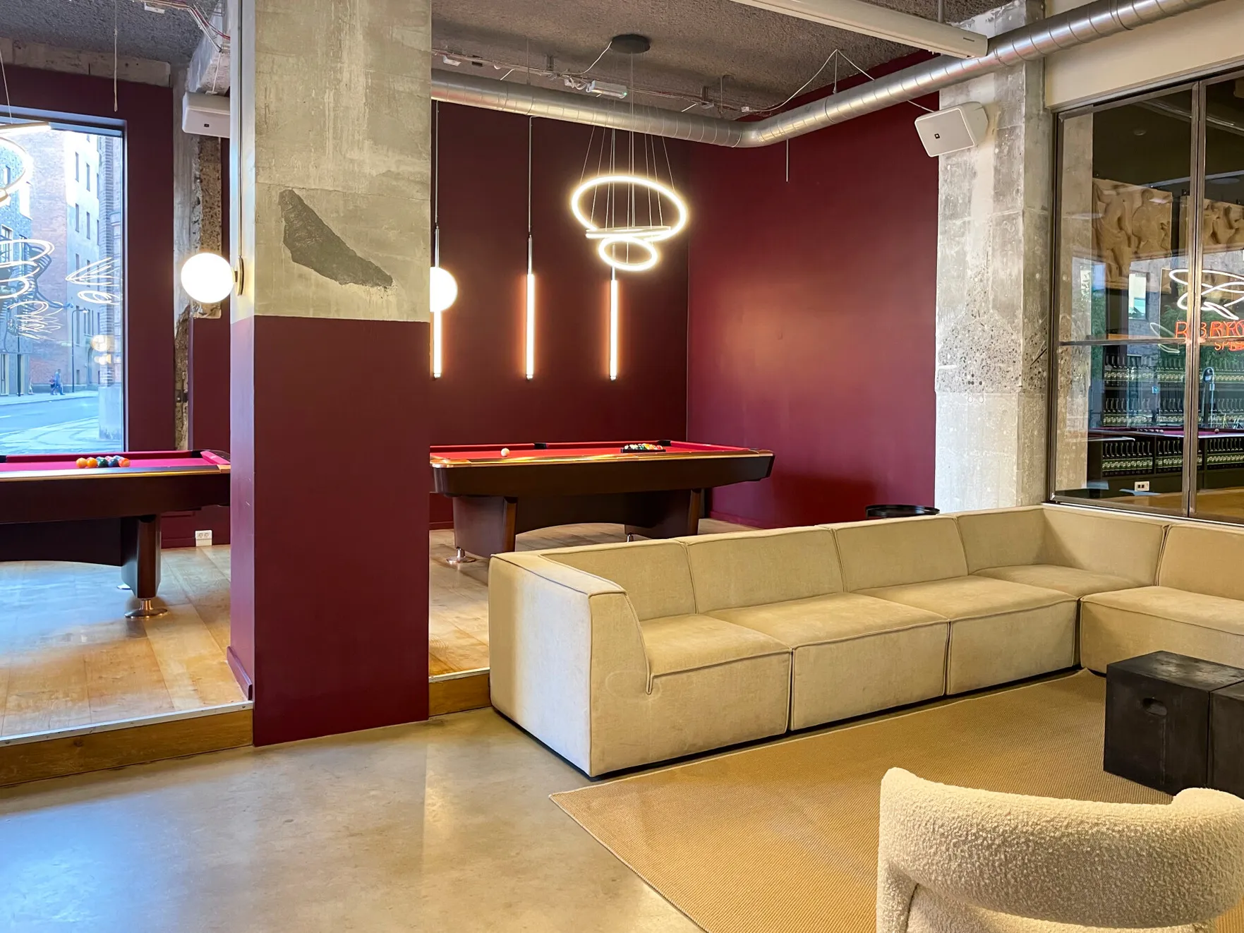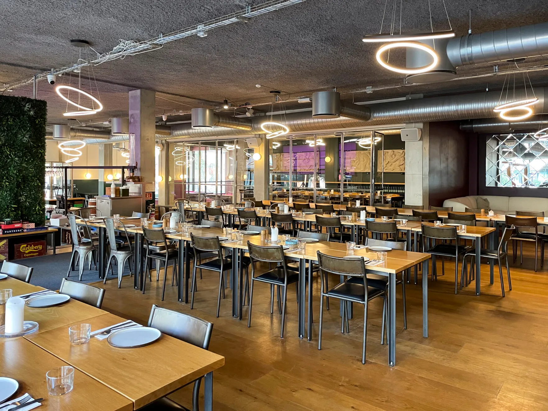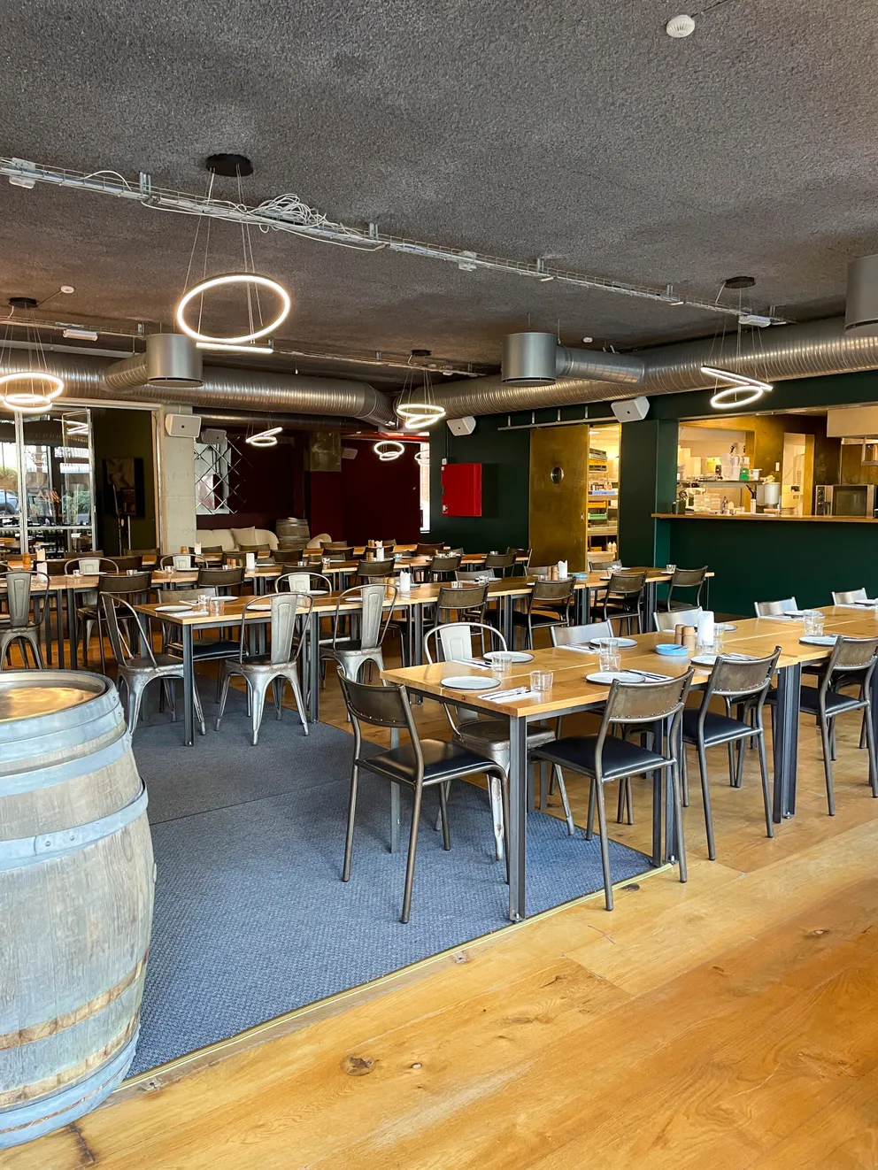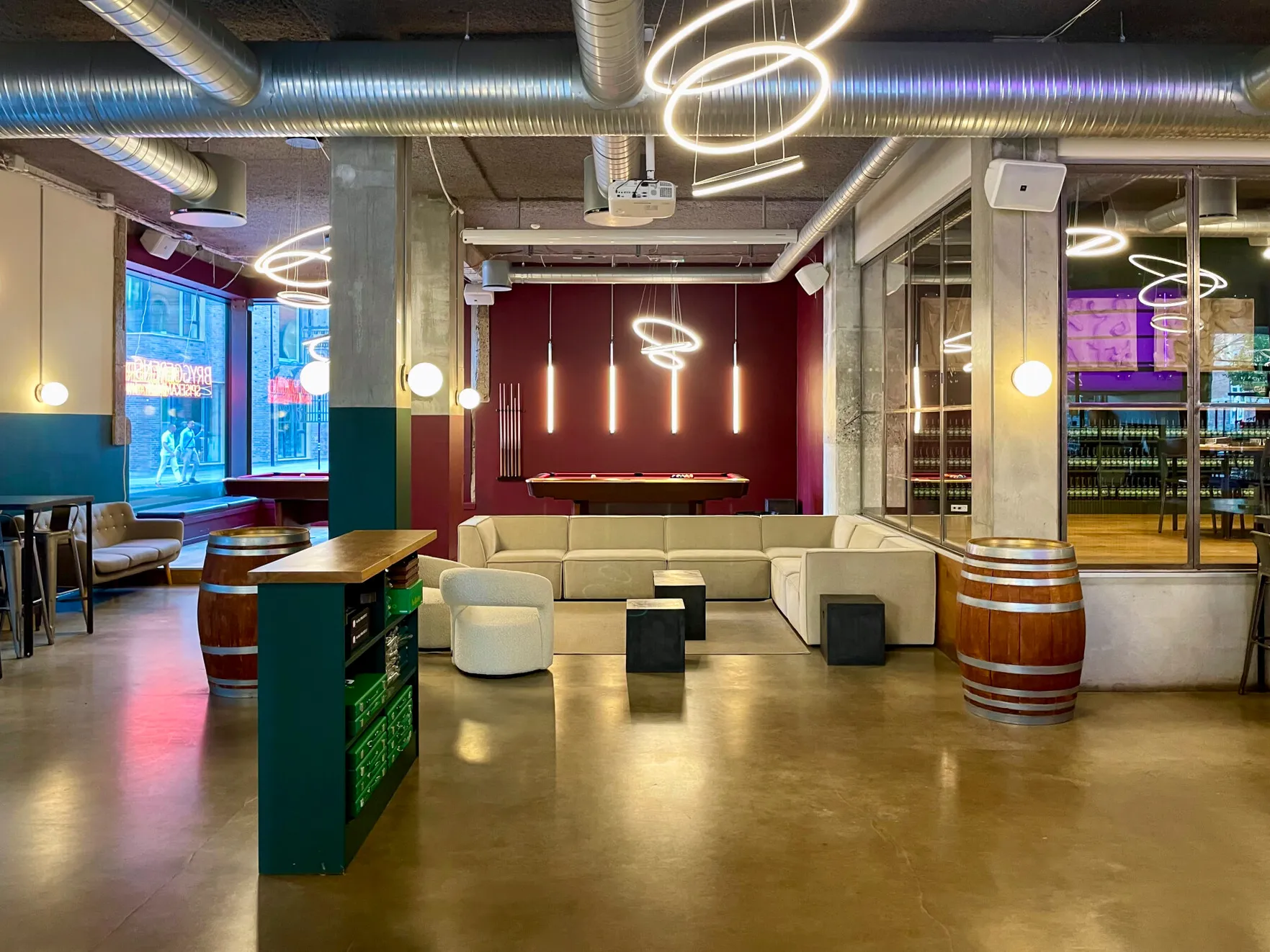 Et stort, lyst og rustikt lokale, opdelt i niveauer, hvor gennemsigtigheden skaber forbindelse på tværs af rummene. Små hjørner giver plads til intimitet og afgrænsning, samtidig med at de indgår naturligt i den større helhed, hvor mange kan samles og føle sig forbundet.