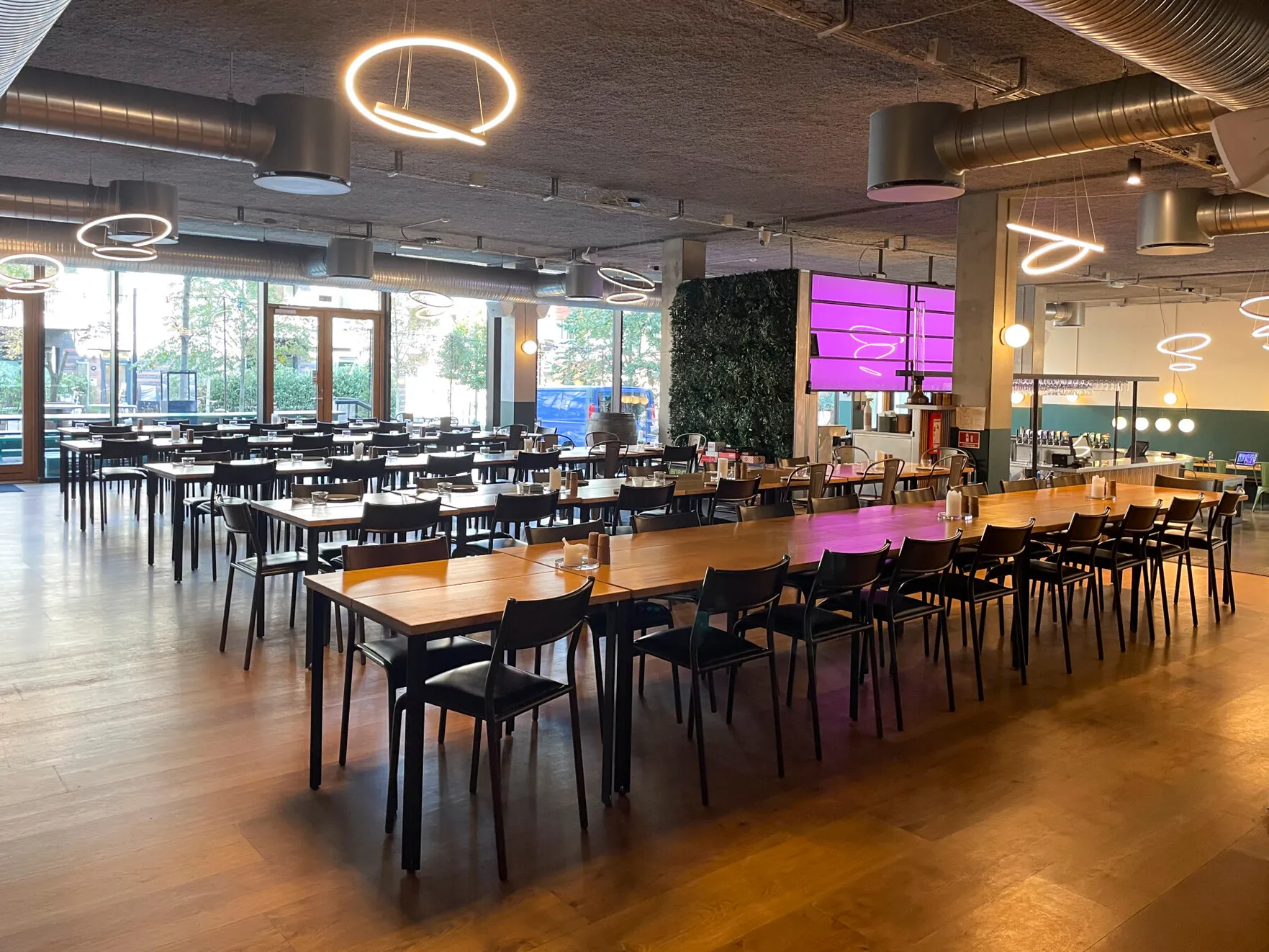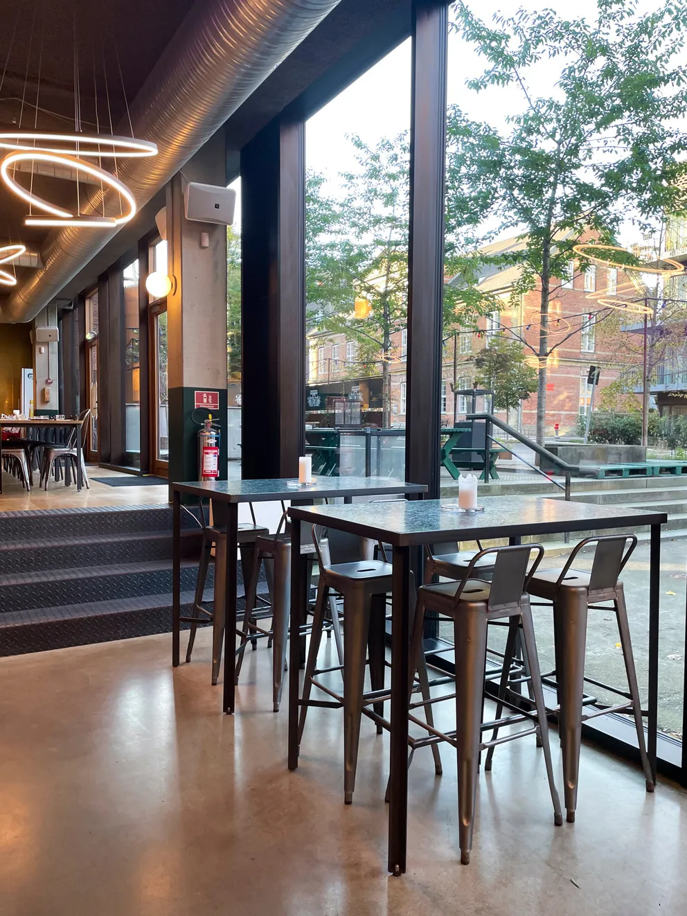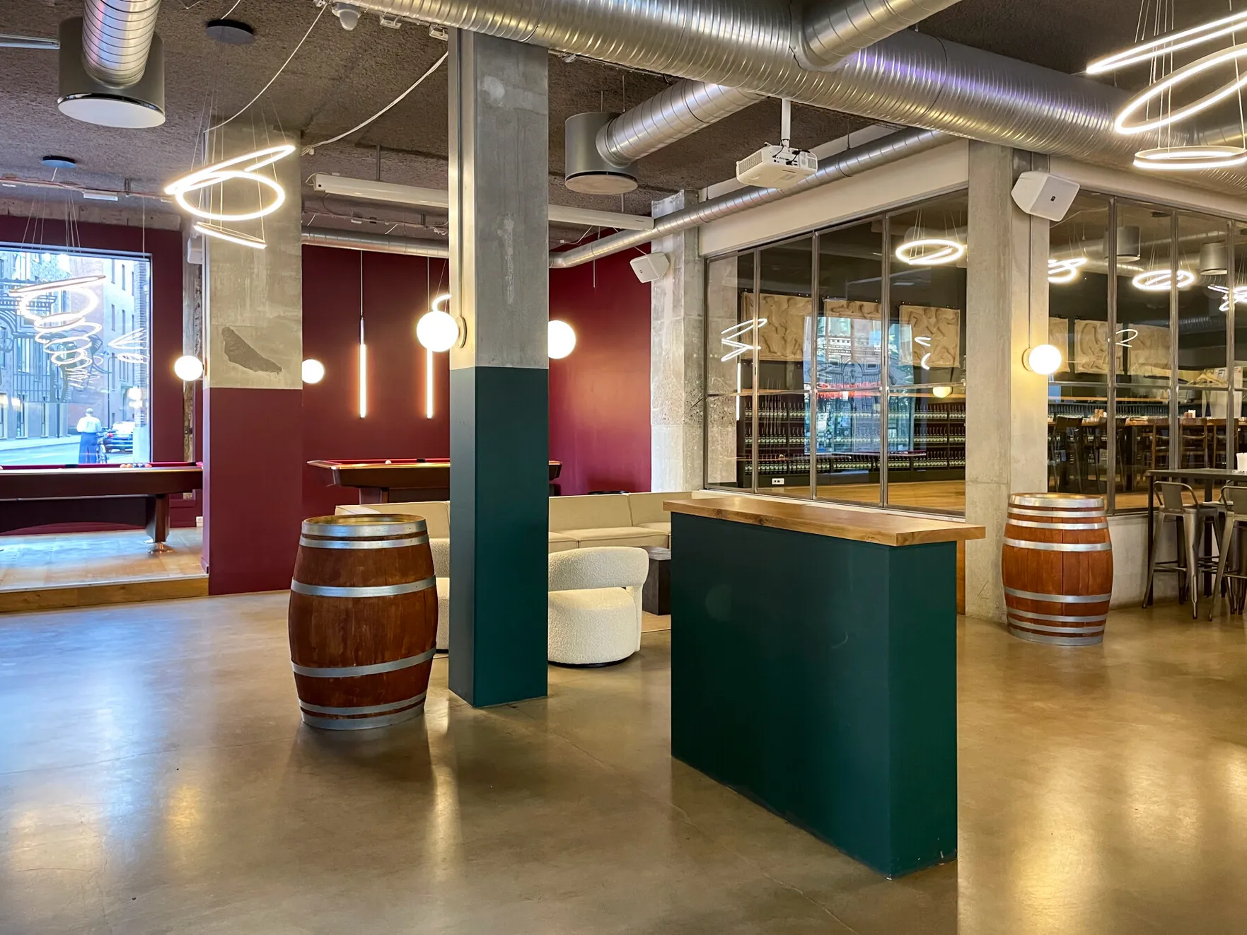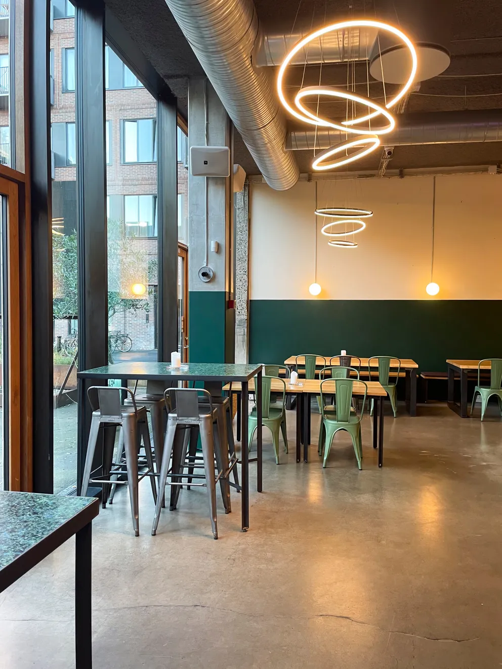 Et stort, lyst og rustikt lokale, opdelt i niveauer, hvor gennemsigtigheden skaber forbindelse på tværs af rummene. Små hjørner giver plads til intimitet og afgrænsning, samtidig med at de indgår naturligt i den større helhed, hvor mange kan samles og føle sig forbundet.