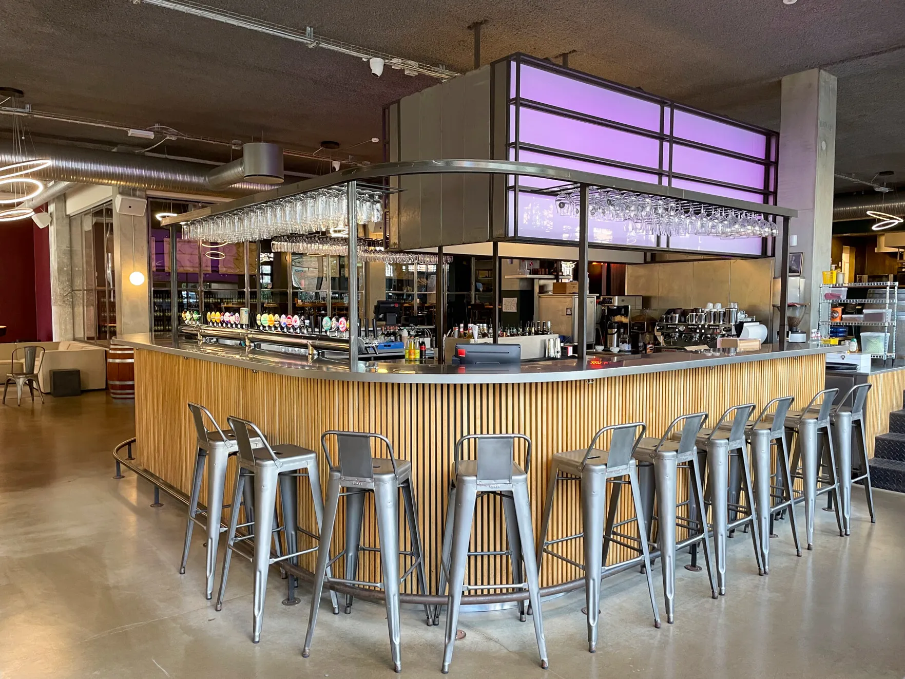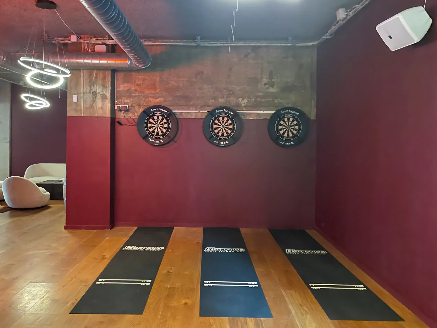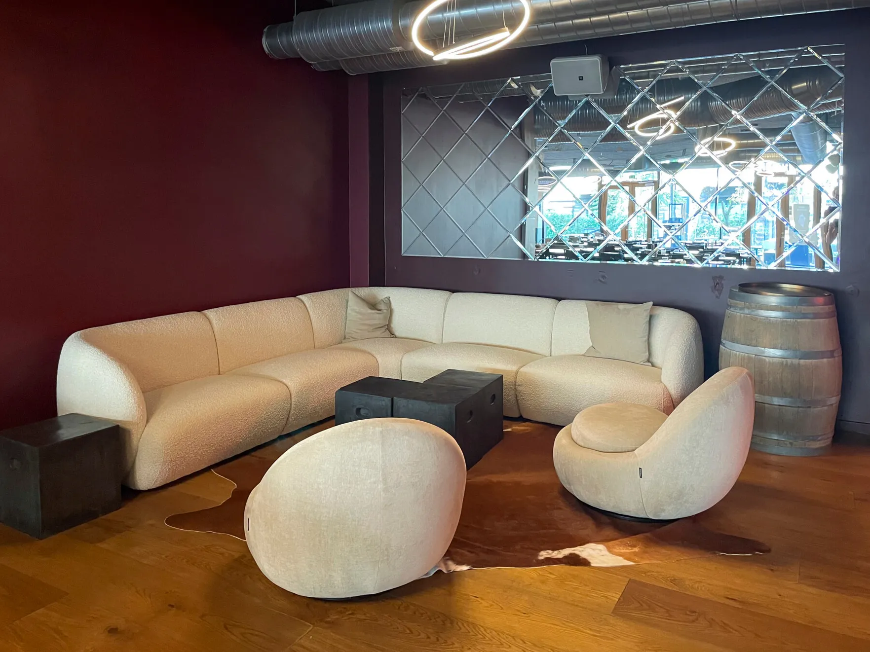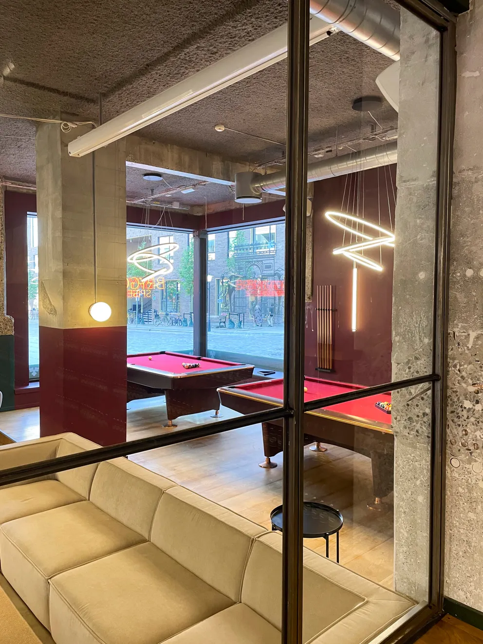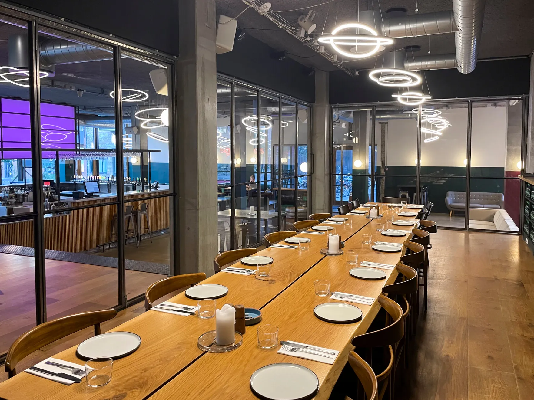 Et stort, lyst og rustikt lokale, opdelt i niveauer, hvor gennemsigtigheden skaber forbindelse på tværs af rummene. Små hjørner giver plads til intimitet og afgrænsning, samtidig med at de indgår naturligt i den større helhed, hvor mange kan samles og føle sig forbundet.